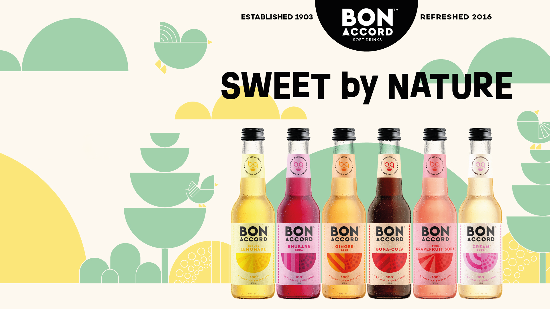 Bon Accord Soft Drinks is a family business established in 1903. We refreshed their brand positioning with a 'Joyfully juicy' strategic brand narrative that better communicates their range of healthier, naturally sweetened, more flavoursome soft drinks and mixers, and supports the delivery of ambitious commercial objectives. Taking inspiration from Bon Accord’s existing logo we created a new visual language introducing patterns, illustrations and a bespoke typographic treatment with which to showcase a new tone of voice.